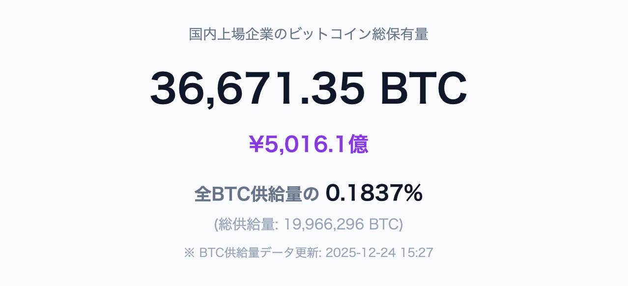 同社は2025年4月16日に16.66BTCを約2億円で初回購入して以降、わずか約8カ月で1,200BTC超を積み上げた。12月だけでも3回の購入(12月3日:54.51BTC、12月16日:18.64BTC、12月24日:18.38BTC)を実施しており、積極的な買い増しを継続している。総投資金額は約184.5億円(18,451,564,958円)で、平均取得単価は1BTC当たり約1,491万円となっている。