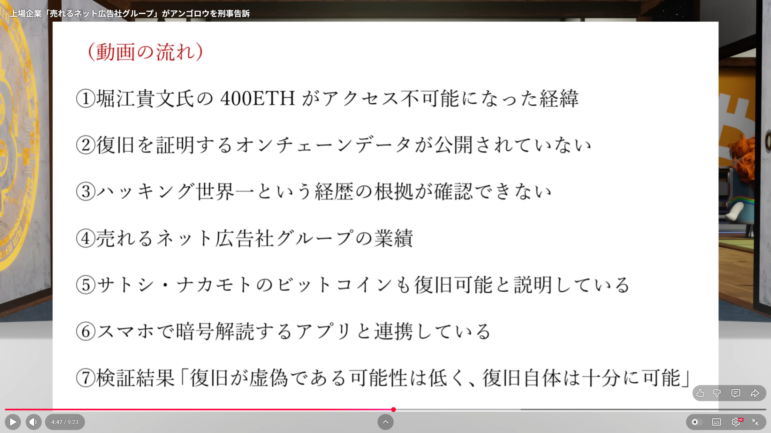 ETHウォレットの復旧に成功したと適時開示している。この発表に対しアンゴロウ氏は、公開情報に基づき不自然な点を指摘する検証動画を公開した。動画の結論は「復旧が虚偽である可能性は低く、復旧自体は十分可能」というものだったという。