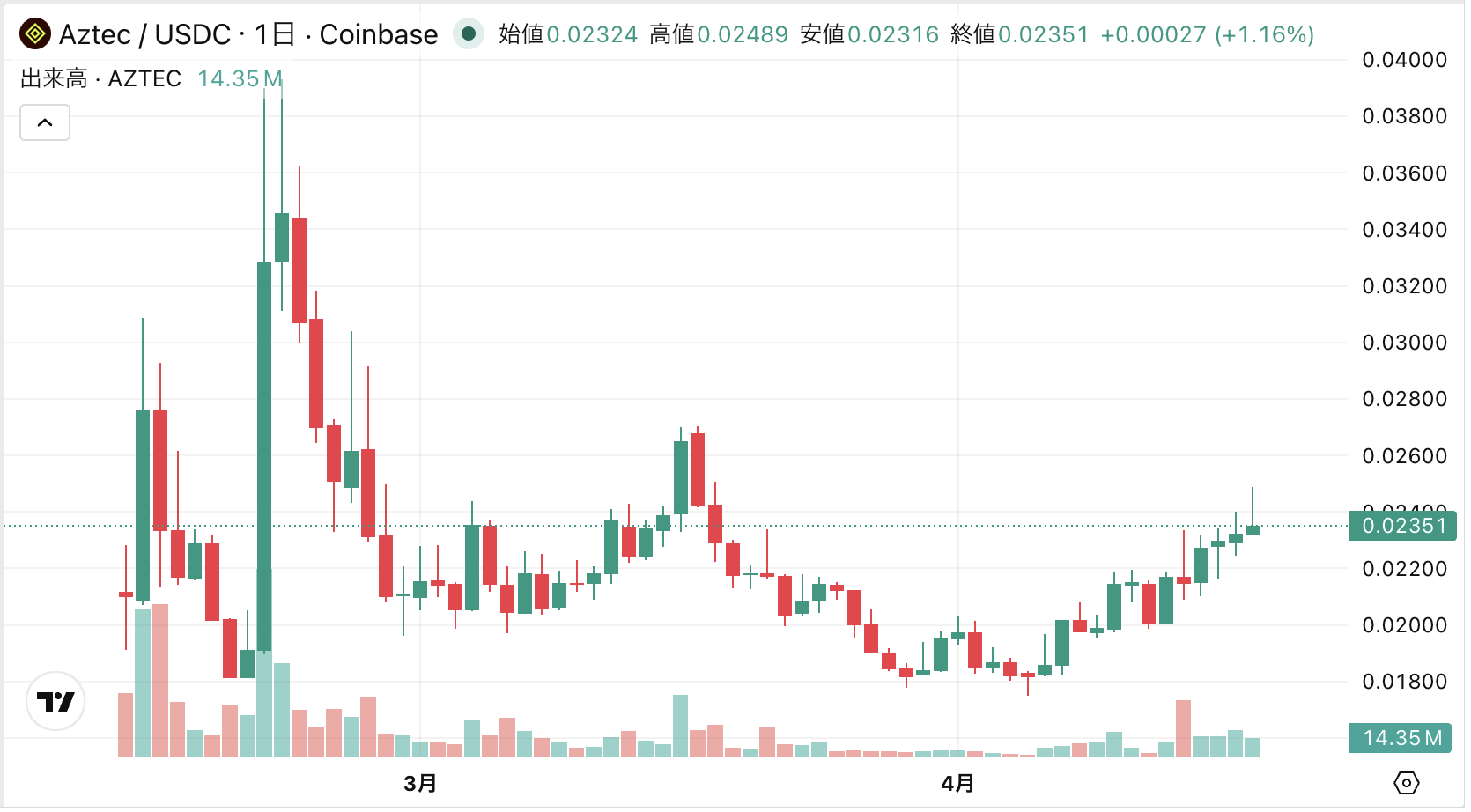 AZTECの価格は苦戦が続いている。現在の価格は約$0.0235で、公募価格$0.0473から約50%の下落となっている。TGE(トークン生成イベント)後の2月21日に記録したATH(過去最高値)$0.04にも遠く及ばず、公募参加者は上場以来ほぼ一貫して含み損を抱えている状態だ。