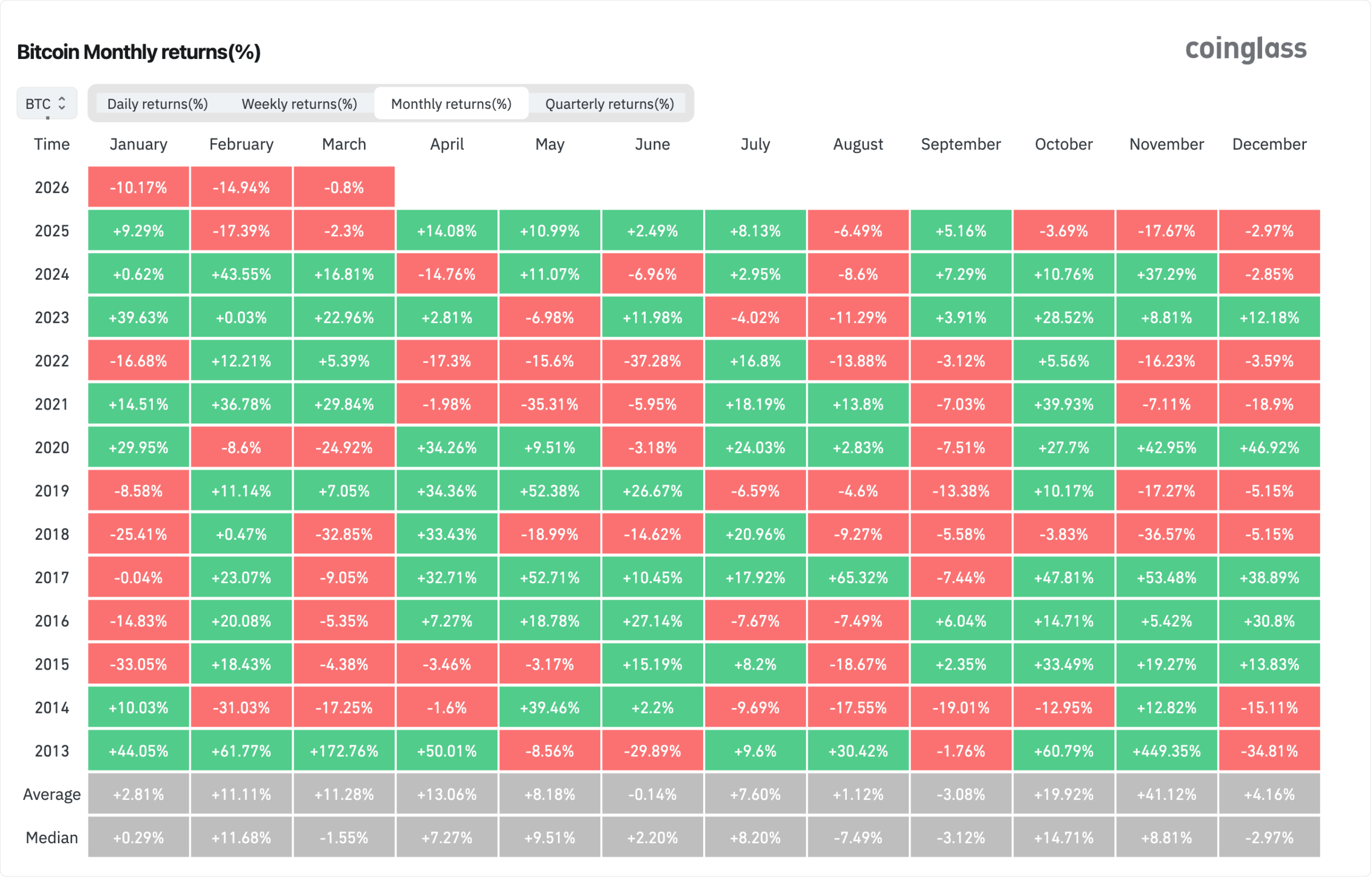 コイングラスのデータによれば、2013年以降の3月の平均リターンは+11.28%だが、中央値は−1.55%と大きく乖離する。2013年3月の+172.76%という記録的な急騰が平均値を大幅に押し上げているためで、外れ値を除いた実態は中央値が示す通りわずかにマイナスとなっている。
