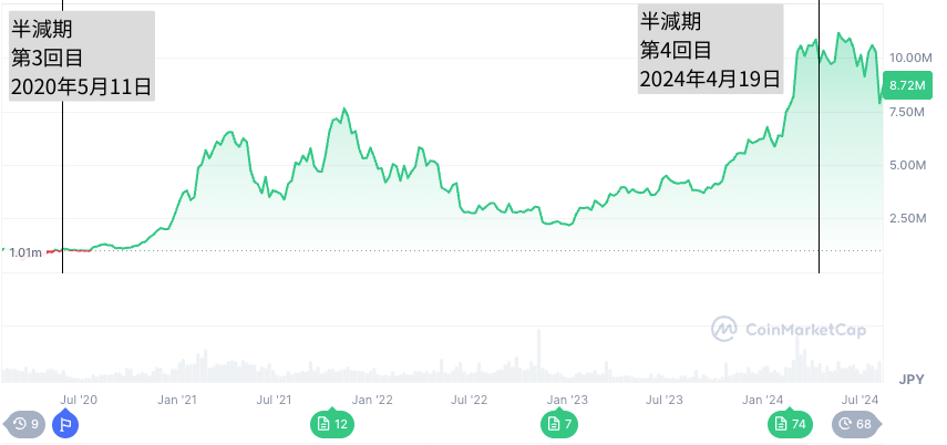 ビットコインの半減期は、これまでに4回発生しています。下の長期チャートを見ると、各半減期の前後で大きな価格変動が起きてきたことがわかります。