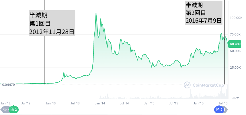 | 第1回 | 210,000 | 2012年11月28日 | 25 BTC |