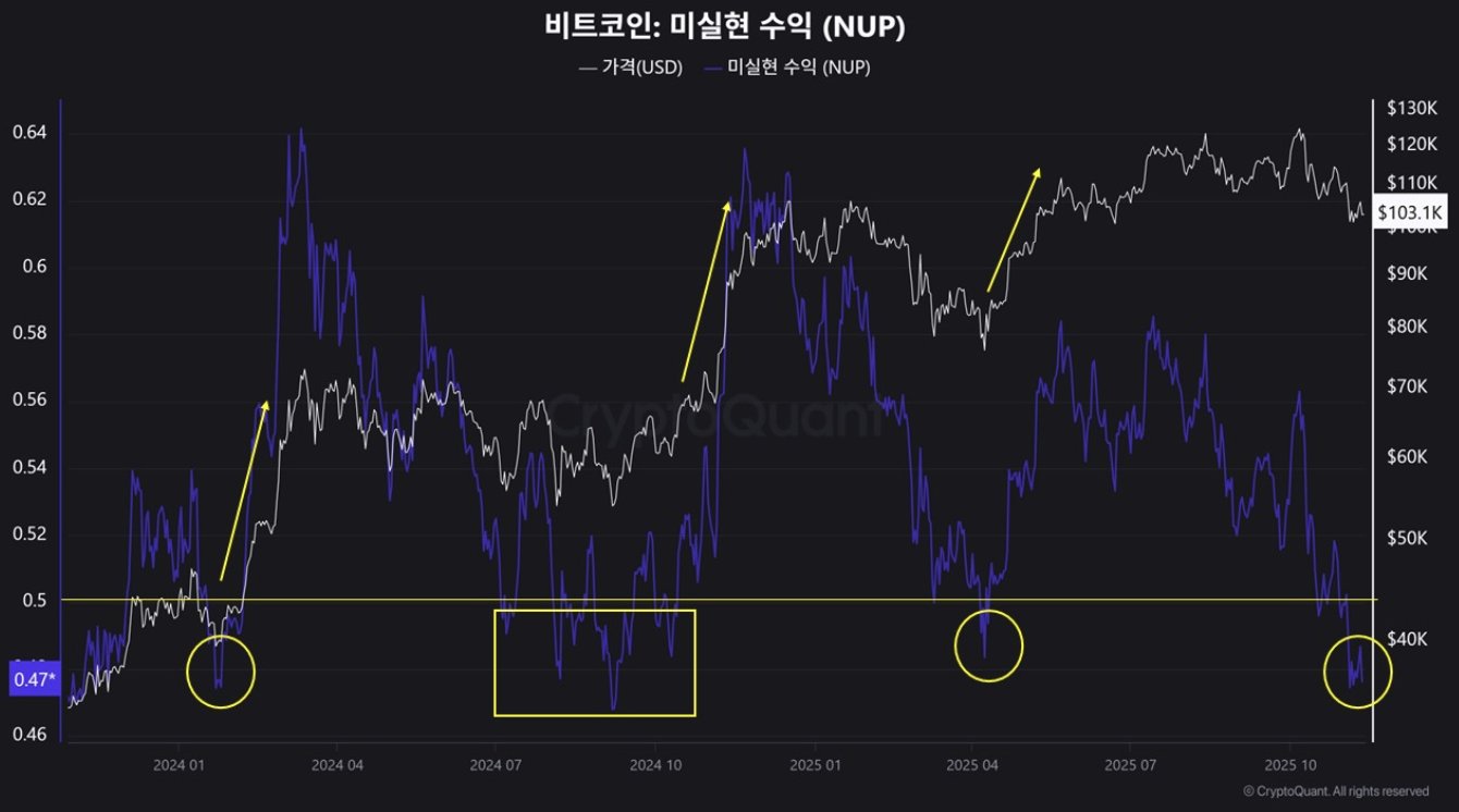 NUP指標は、市場全体でどれだけの含み益(未実現利益)があるかを示すオンチェーン指標で、高い値は強い売り圧力を意味する。コインケアの分析では、今回のサイクルにおいて、NUPが0.5を下回ると短期的な底を形成するパターンが複数回確認されている。