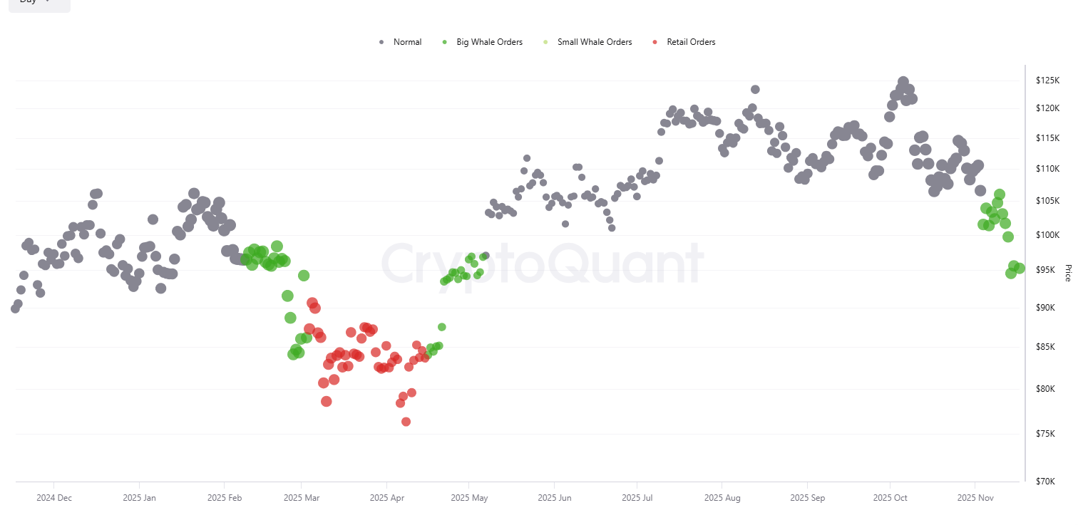 このグラフに表示されているグリーンの円は、クジラによるビットコイン購入が優勢であることを示し、レッドは個人投資家優勢を示唆、グレーの円は中立状態を表している。5月以降はしばらく中立状態が続いていたが、11月に入りグリーン一色に。