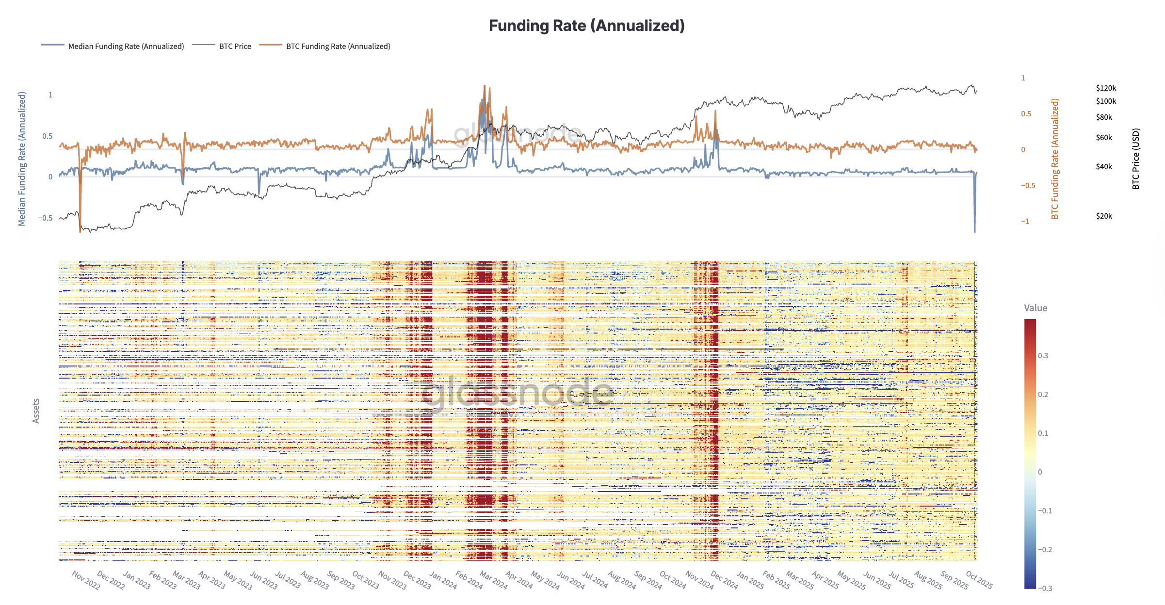 先物市場のストレスは、ファンディングレート(資金調達率)の急落にも表れている。無期限先物のファンディングレートは年率換算で一時的に大幅なマイナスに転じ、2022年後半のFTX破綻以来の水準まで低下した。