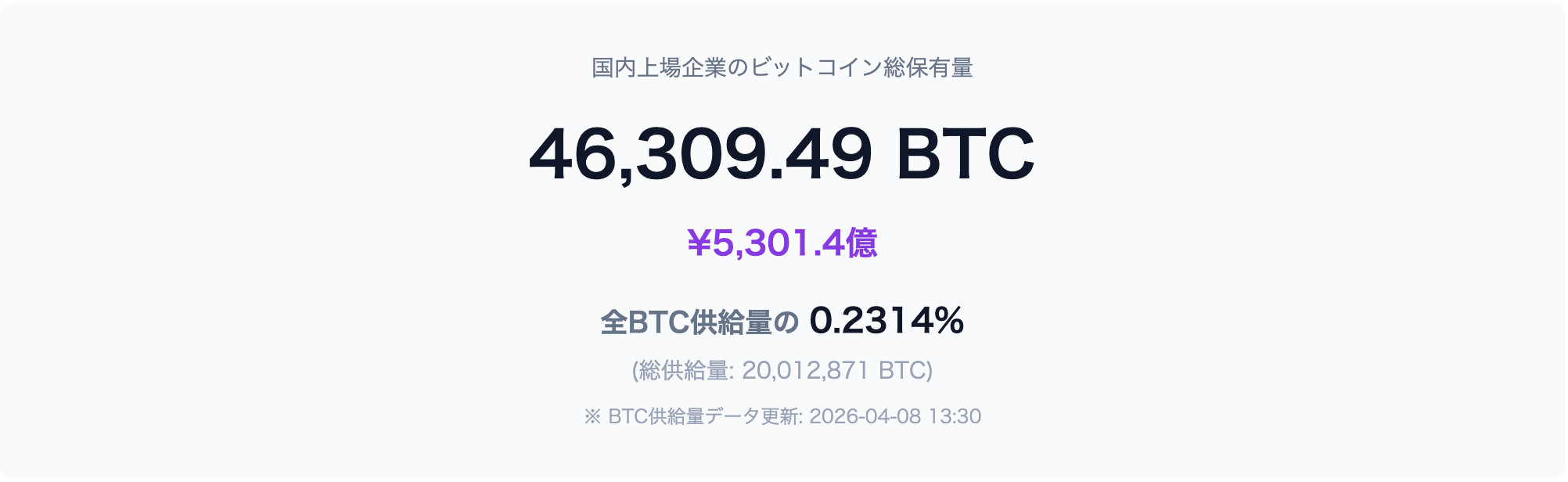 4月8日時点の集計では、国内上場企業19社のBTC総保有量は46,309.49BTC、評価額は約5,301億円で、全BTC供給量の0.2314%を占める。メタプラネットは40,177BTCで国内の保有量1位を維持し、全体の約87%を保有する。インカムの創出、ゴールドとの併用、段階的な取得など、上場企業によるBTC活用の手法の違いが目立っている状況だ。