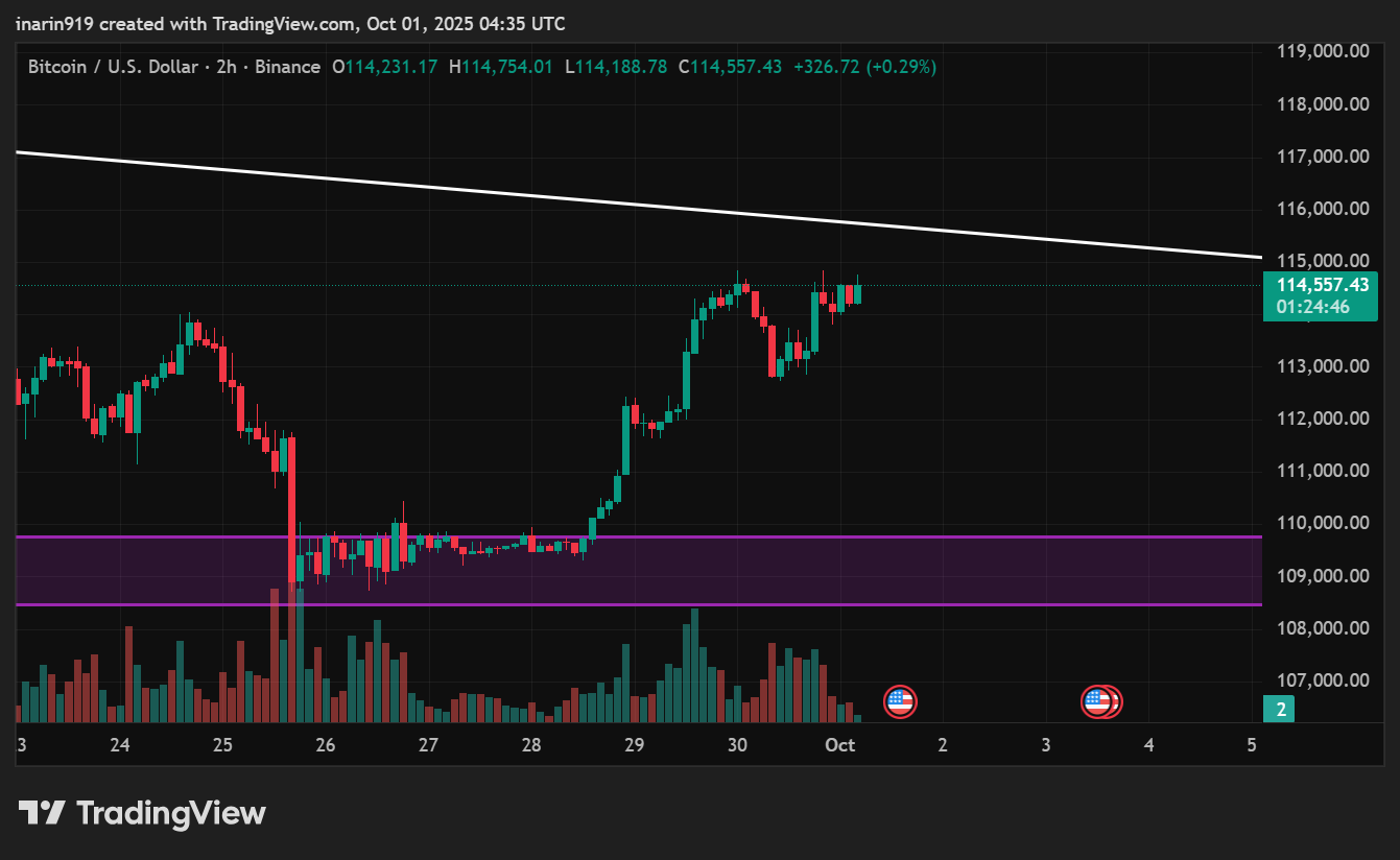 ETFの流入はBTCの価格にも反映されている。米国閉鎖懸念を受け、一時112,800ドル台までの下落は見せたものの、現在は114,000ドル台に回帰。その後も上値を維持しており、日足レベルの下降チャネル上限を目指す動きは変わらない。
