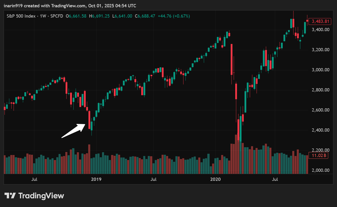 直近では2018年12月22日〜2019年1月25日まで、史上最長35日間の米政府閉鎖が行われた。当時、S&P500は政府閉鎖直前に20%の急落を見せ市場には「弱気相場入り」という声が囁かれた。ただ、この時は政府閉鎖だけでなく世界的な景気懸念が重なっていたため、純粋に「閉鎖が原因で暴落」とは言い切れない。