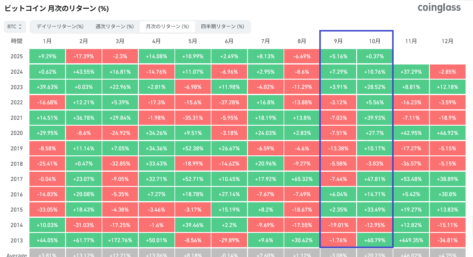 また歴史的に見て9月はBTCにとって弱気な月だが、今年はプラス5.16%と好調。10月はほとんどの一年の中で最もリターン率の高い月として知られるが、9月がプラスで引けた年に限定すると、全ての年で大きな上昇を見せている。さらに、9月、10月をプラスで終えた年は、翌11月も全て上昇。この強気なデータから、BTCバブル再開への期待が高まっている。