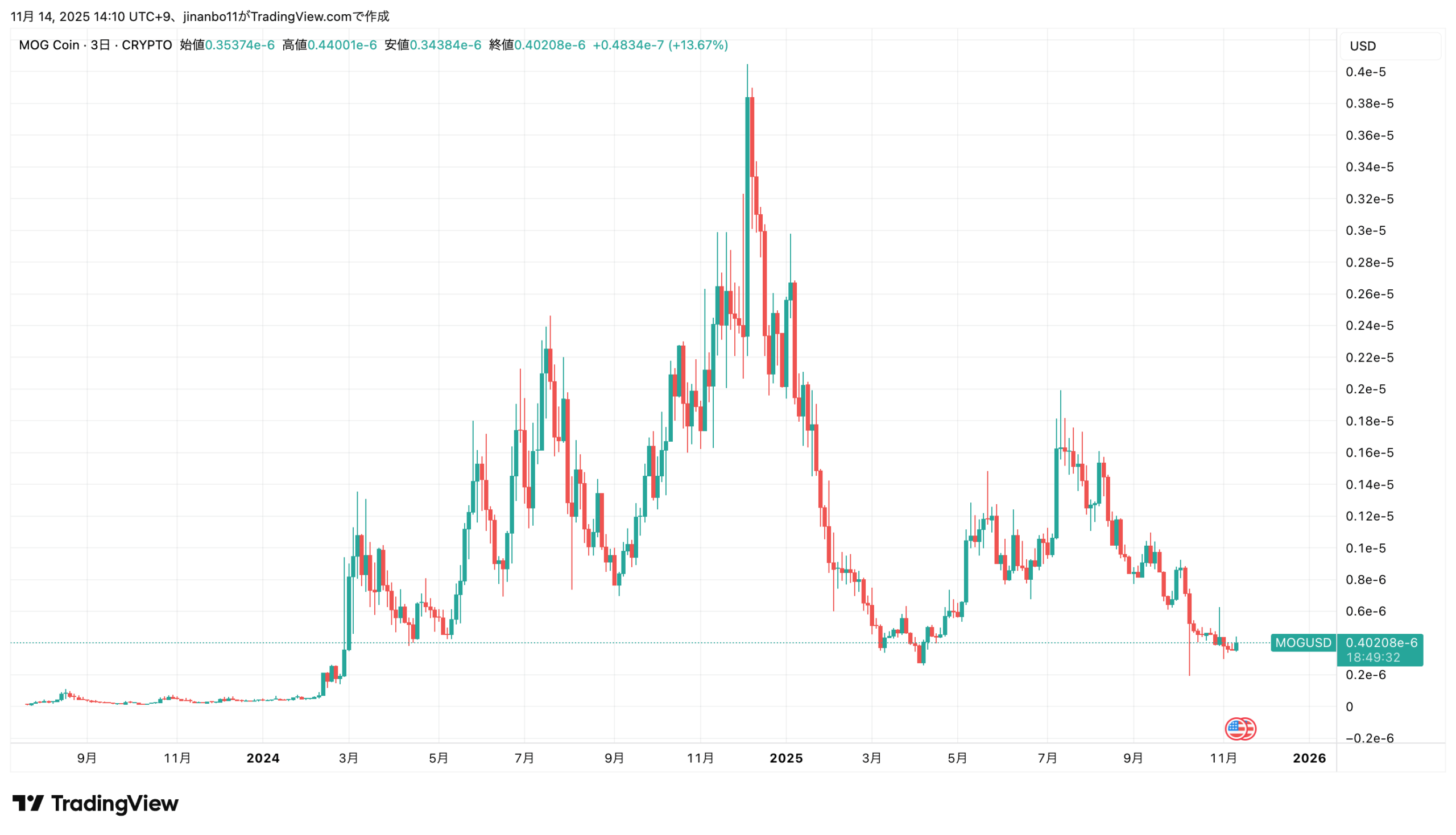 MOGは14日14時10分時点で0.000000402ドルで取引されており、2023年後半の取引開始以降、大きな価格変動を繰り返している。2024年12月には約0.0000044ドルまで急騰したが、その後約90%下落し、現在は低水準で推移している。この高いボラティリティは、届出書で指摘された「極めて投機的」という性質を反映している。