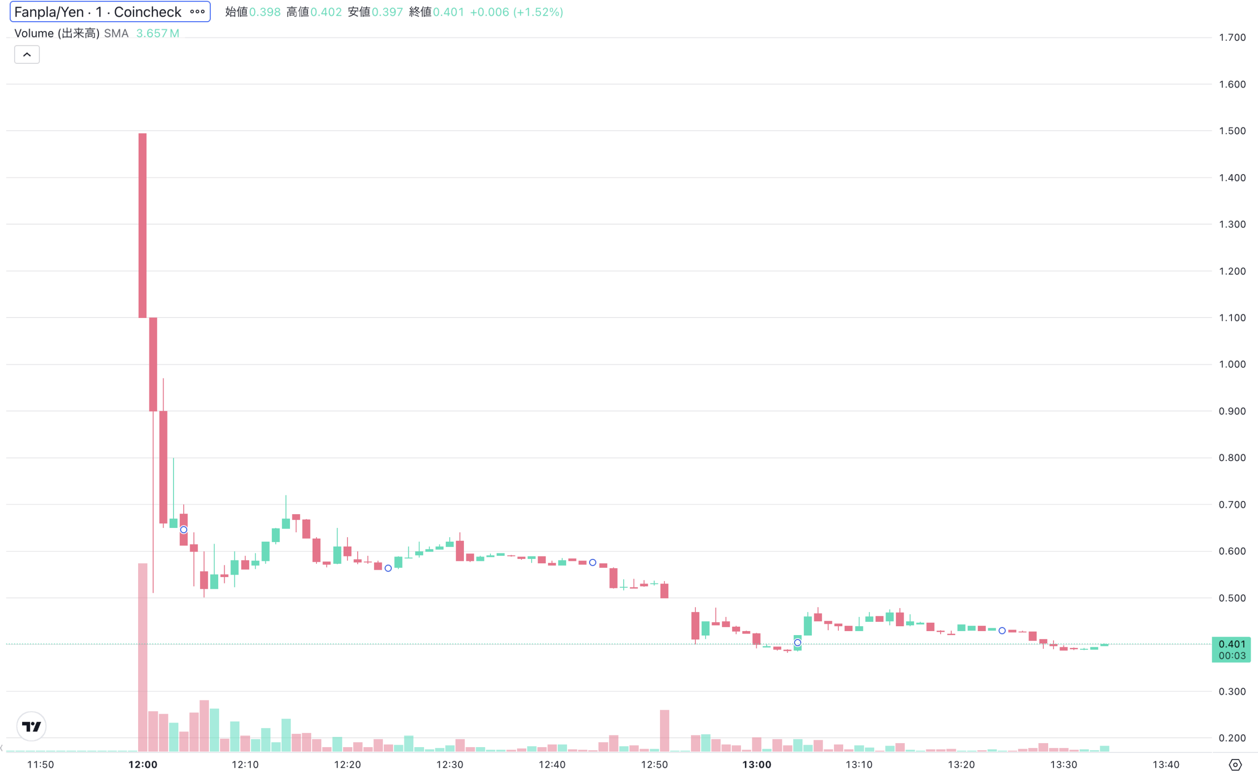 暗号資産(仮想通貨)取引所コインチェックは11日正午、IEO(Initial Exchange Offering)で販売した暗号資産Fanpla(ファンプラ、FPL)の取引を開始した。上場直後に初値1.5円(公募価格の1.5倍)を付けたものの、その後急落し、13時34分時点で0.401円と公募価格1円から59.9%下落している。