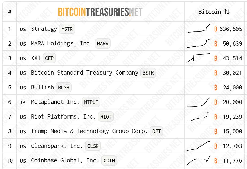 2位には米マイニング企業「Marathon Digital(マラソンデジタル)」が入り、約5万639BTCを保有。続いてソフトバンクやテザーが出資する米ビットコイン投資企業「Twenty One Capital(21キャピタル)」が4万3,514BTCと続いている。