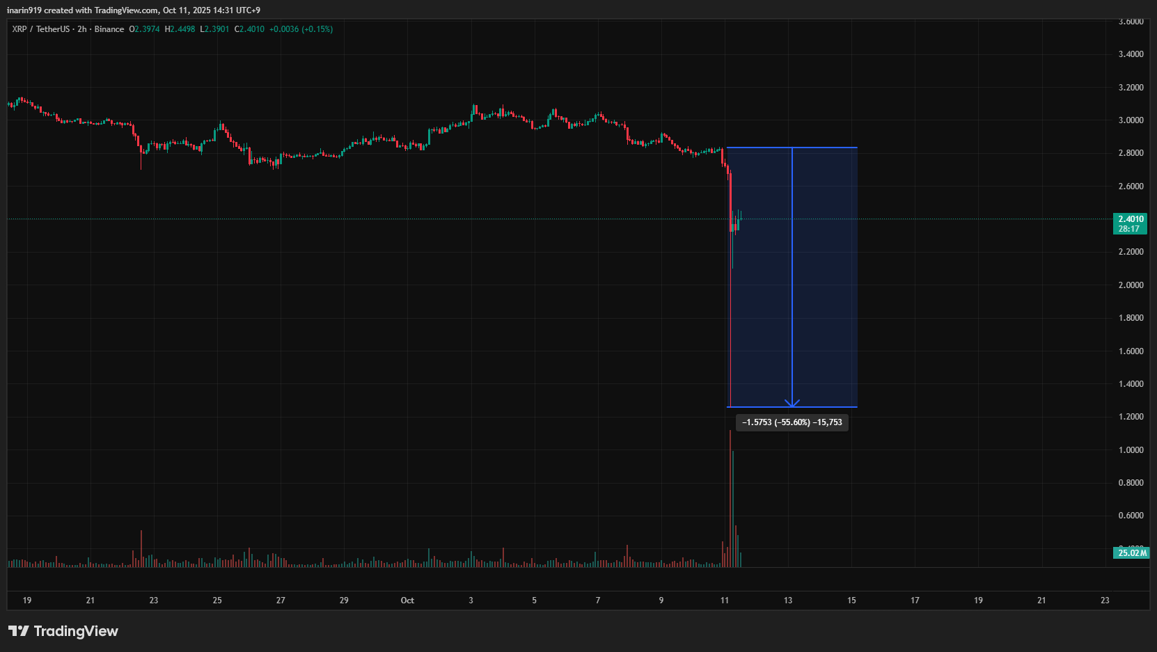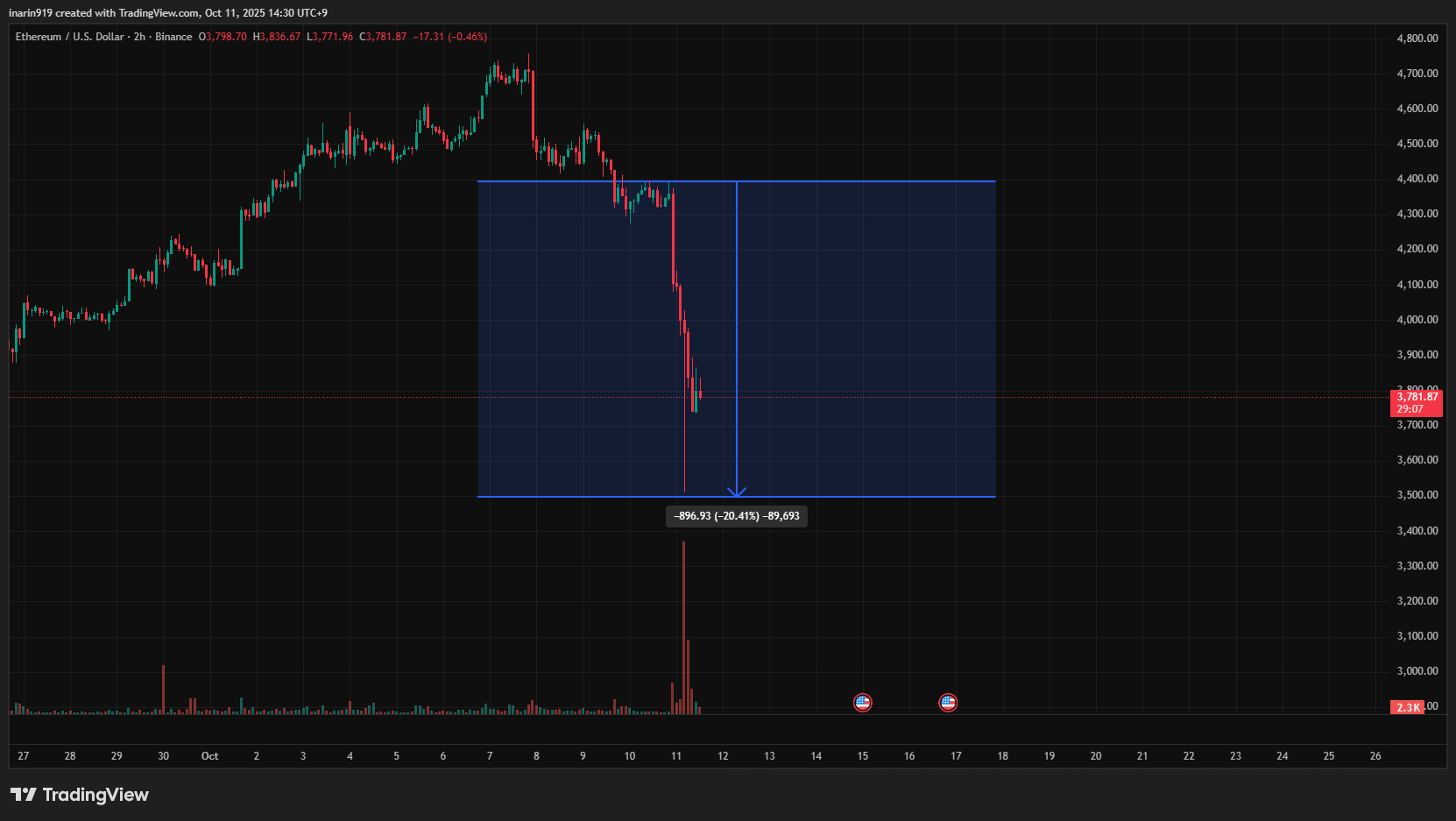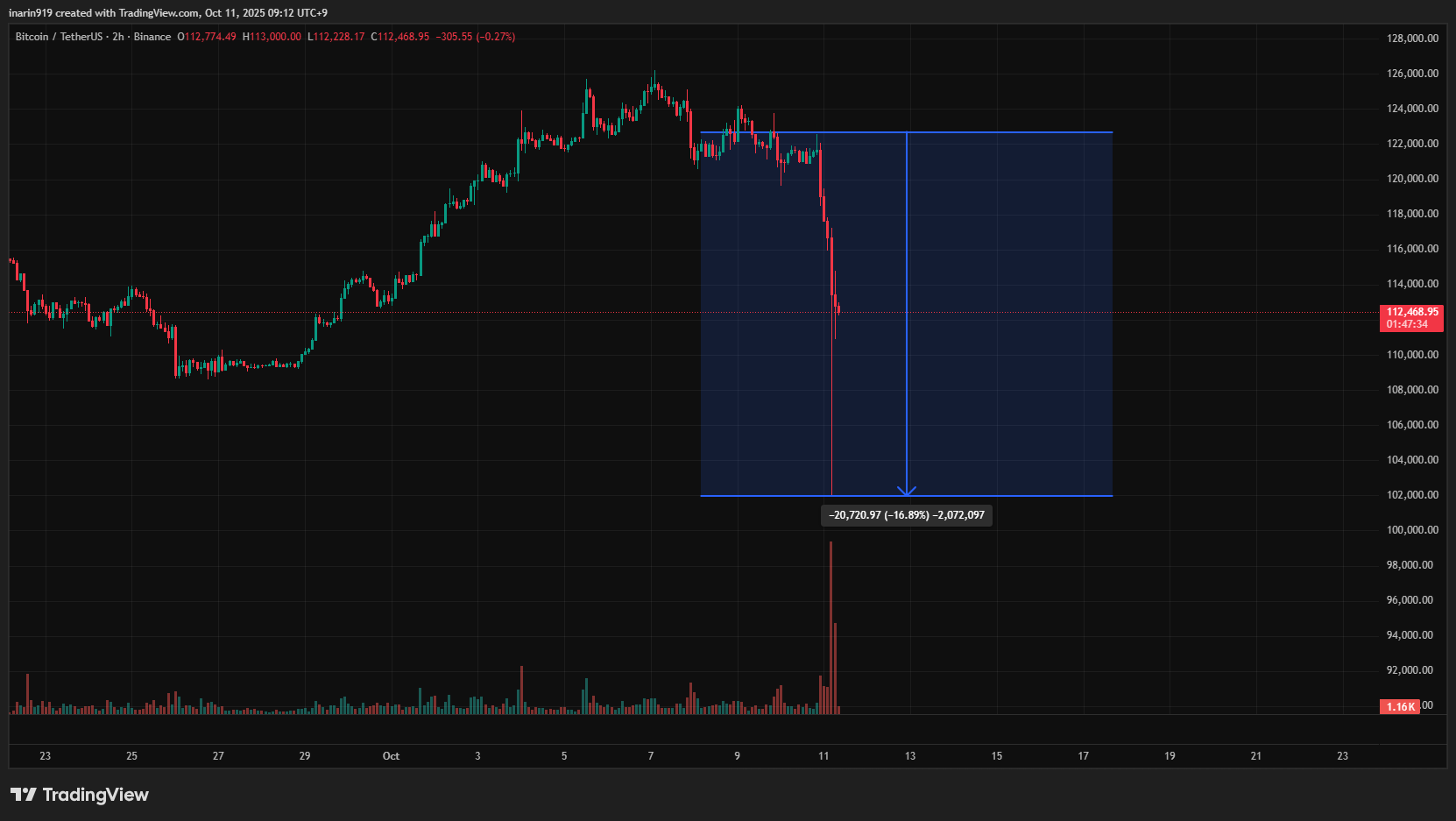 その後トランプ氏がTruth Socialに「米国は中国に対し現在課している関税に加え100%の関税を課す」という内容を含めた投稿をアップしたことに反応し、11日午前6時ころからさらに急落。12万5,000ドルから10万2,000ドル付近まで、実に約17%という大幅下落となった。
