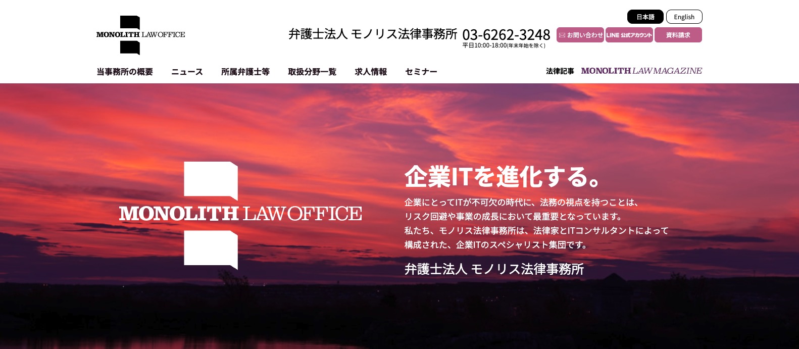 | 6 | モノリス法律事務所 | 東京 | 暗号資産、NFT、ブロックチェーン、IT法務 | https://monolith.law/ |