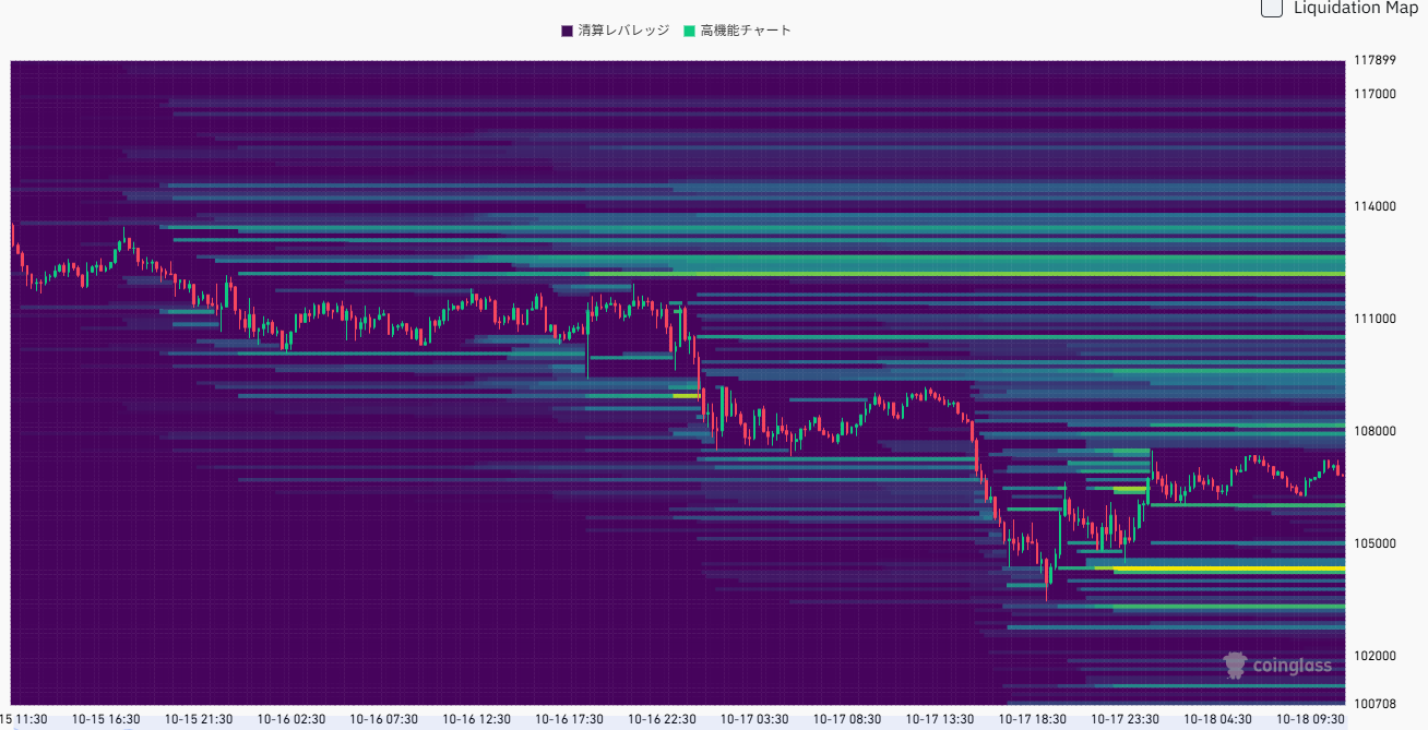 ヒートマップを見ると、10万4,000ドル付近の大きな流動性クラスターが形成されており、この価格帯が直近のサポートとして機能しそうだ。ただ、そこから下は板が薄いため、サポートをブレイクした際は10万ドル付近まで急落する恐れもある。