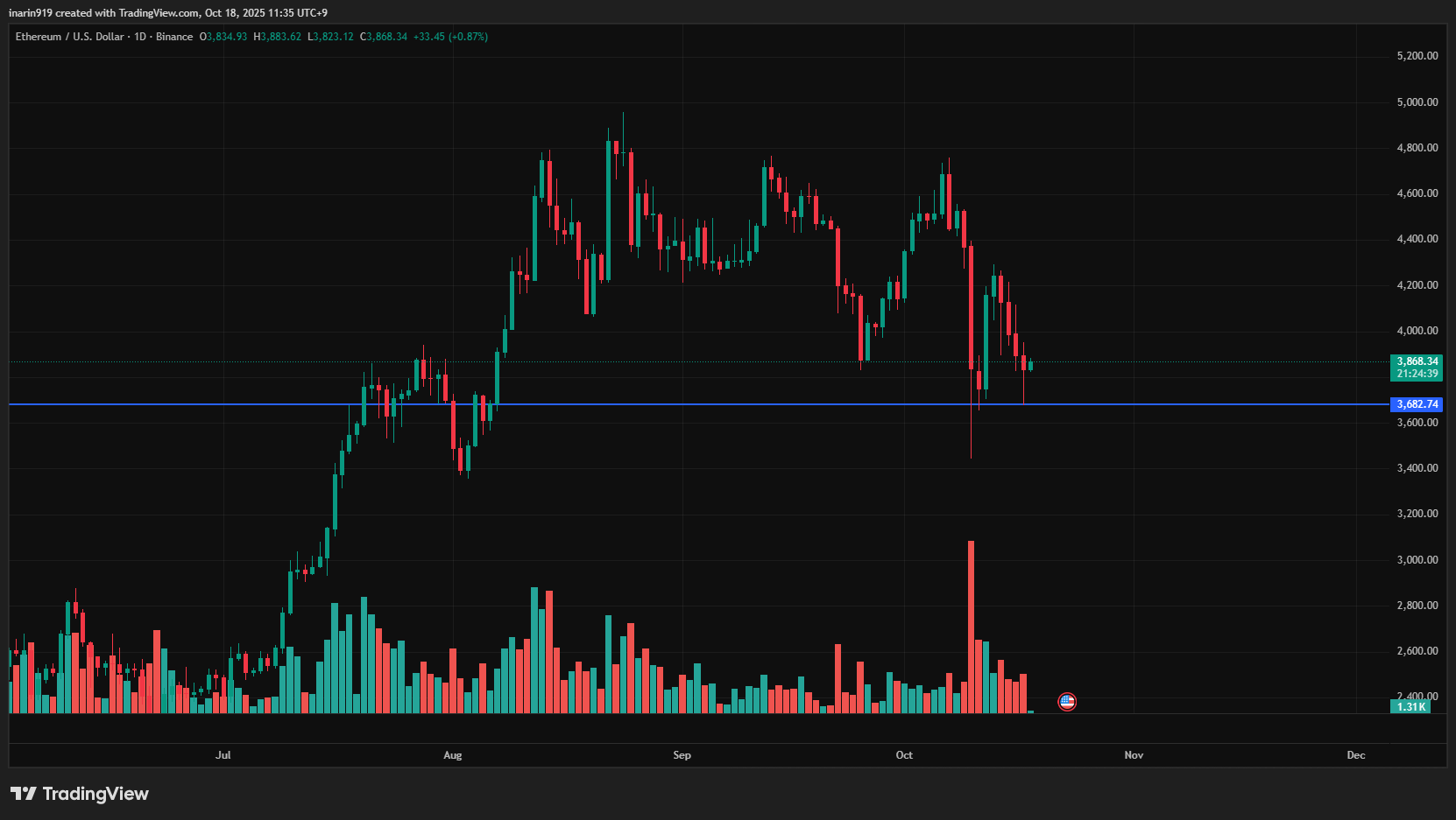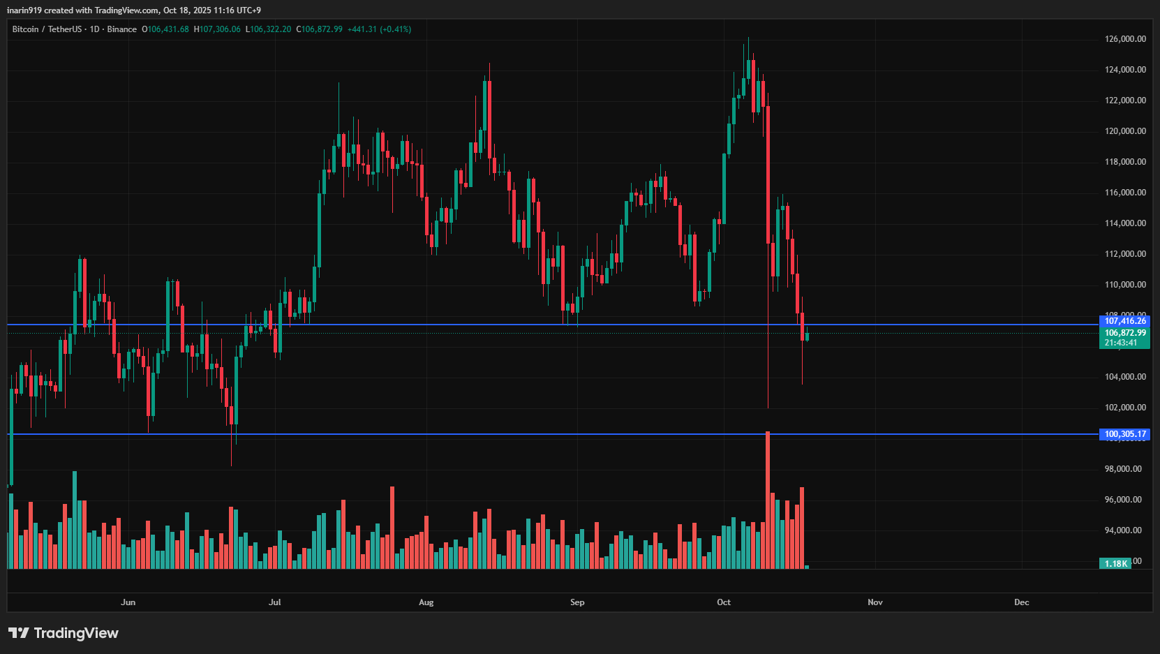 ビットコインは今週火曜から金曜まで4日連続で陰線。さらに10万7,000ドルのサポートラインを割ったことで日足レベルのダブルトップが完成。