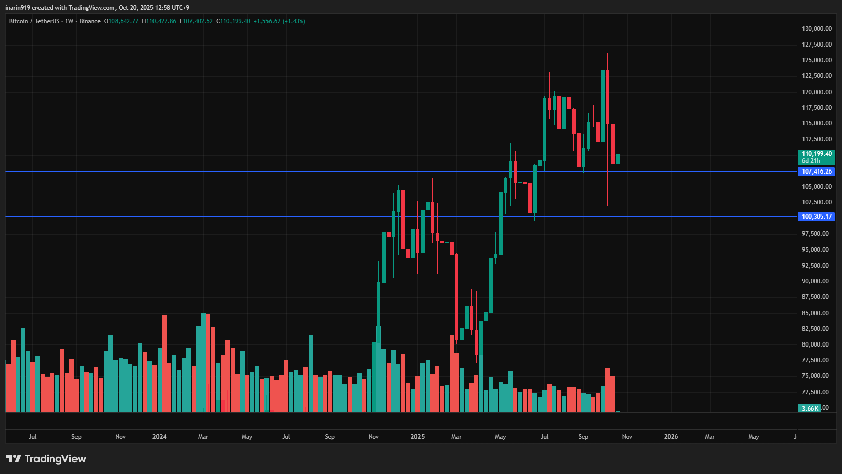ビットコインは先週末、一時10万7,000ドルの重要なサポートラインを大きく下回ったが、10万4,000ドル付近から反転。週足の実体レベルでサポート防衛に成功し、投資家心理がやや改善した。