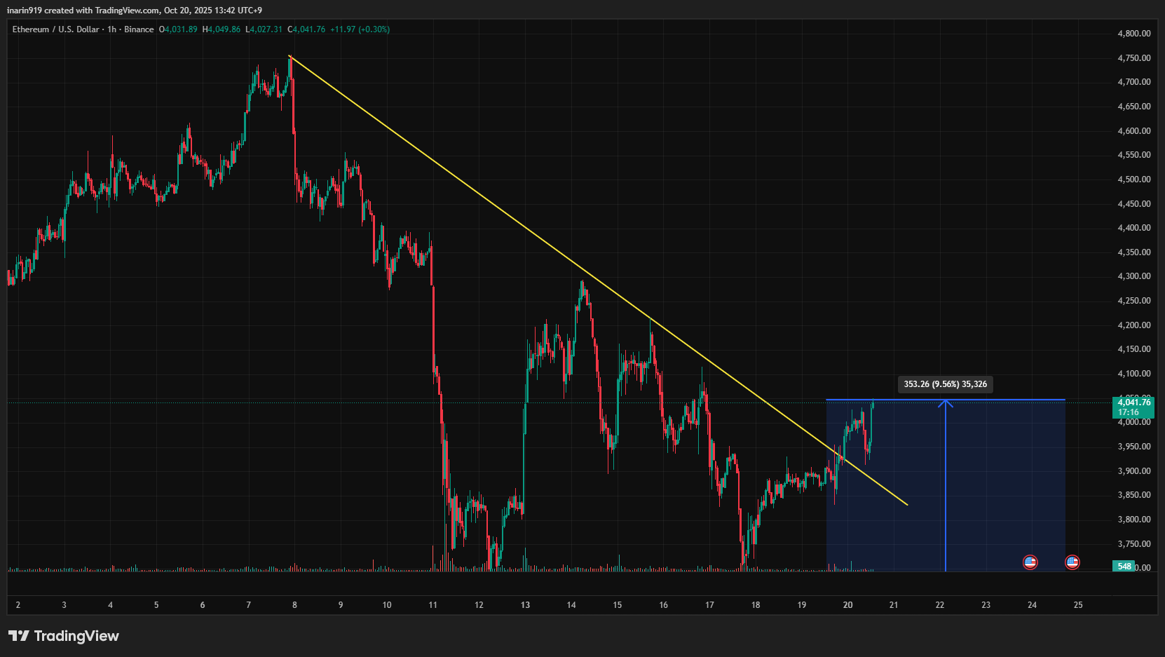 主要アルトコインも概ね直近安値から10%程度の上昇と比較的堅調。特にイーサリアムは約半月にわたり、上値を抑えていた下降トレンドラインをブレイクしたことが、投資家心理の回復につながっている。
