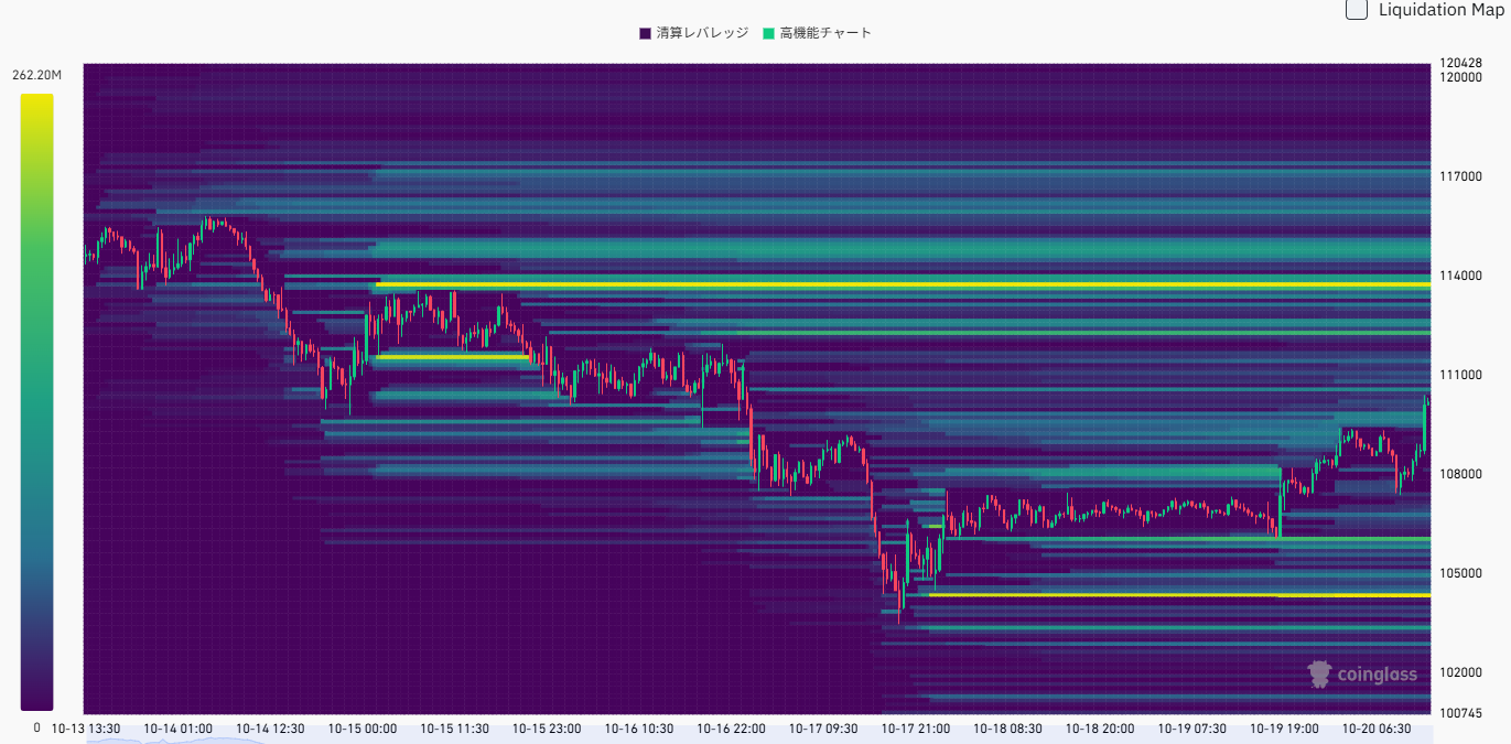 清算ヒートマップからも、先週指摘した10万4,000ドル付近のサポートが強く意識されていたのがわかる。その後、10万8,000ドル付近から断続的に続いていたショートポジションの流動性を燃料に、11万ドル台まで堅調に推移。今後は大きな流動性クラスターが形成されている11万4,000ドル付近の抵抗が意識されそうだ。次の抵抗を明確に突破できれば、市場心理は強気に傾き始める可能性が高い。