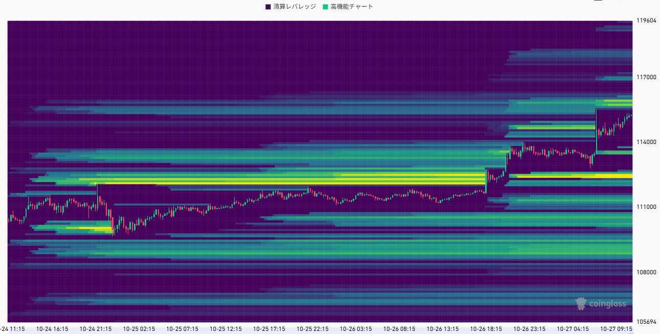 清算ヒートマップを見ると、ビットコインは大規模な流動性クラスターが形成されていた11万2,000ドル付近を明確に上抜け後、ショートポジションのロスカットを巻き込んで大きく上昇。その後、同価格帯に再びクラスターが形成されており、レジスタンスからサポートへの転換が確認できる。今後も11万2,000ドル付近の価格帯は強く意識される可能性が高いと分析される。