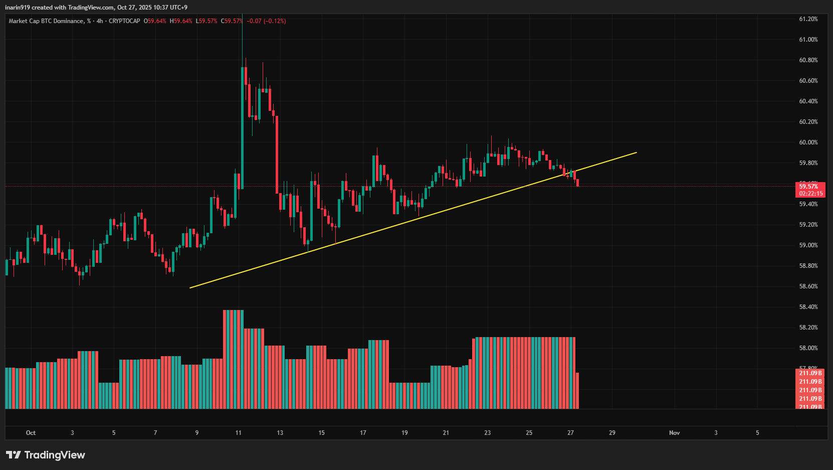 しばらく上昇基調だったビットコインドミナンスもようやく下落傾向を見せ、上昇トレンドラインを下抜け。今後アルトコインへの資金流入加速が期待される。