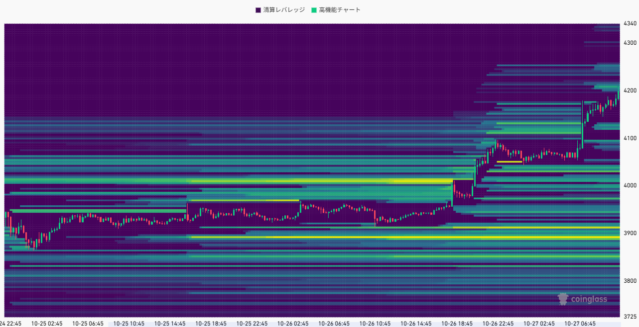 清算ヒートマップを見ると、大規模な流動性クラスターが形成されていた4,000ドル付近を明確にブレイク後、モメンタムの加速が確認できる。現在の価格より上にクラスターが確認できないことから、市場の目線は上方向に傾いていると分析される。