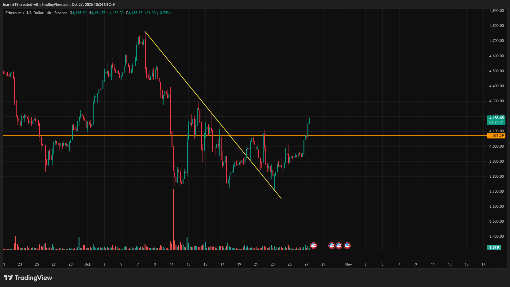 イーサリアムは、強く意識されていた4,000ドル付近の抵抗を明確に突破。主要アルトコインも軒並み強い値動きを見せており、全体的にビットコインよりモメンタムが強い印象だ。