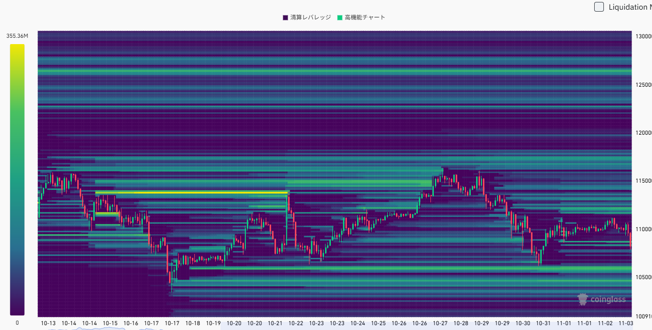 清算ヒートマップを見ると、11万2,000ドル付近と10万6,000ドル付近に中規模の流動性クラスターを確認できる。