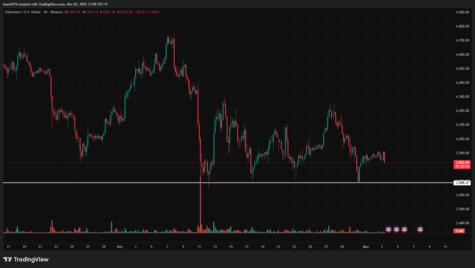 イーサリアムは3,700ドル付近のサポートで買い支えられたものの、過去の反発と比べると戻りが弱く、またいつ下値を試してもおかしくない状況。ソラナ・XRPもほぼ同様の値動きを見せている。
