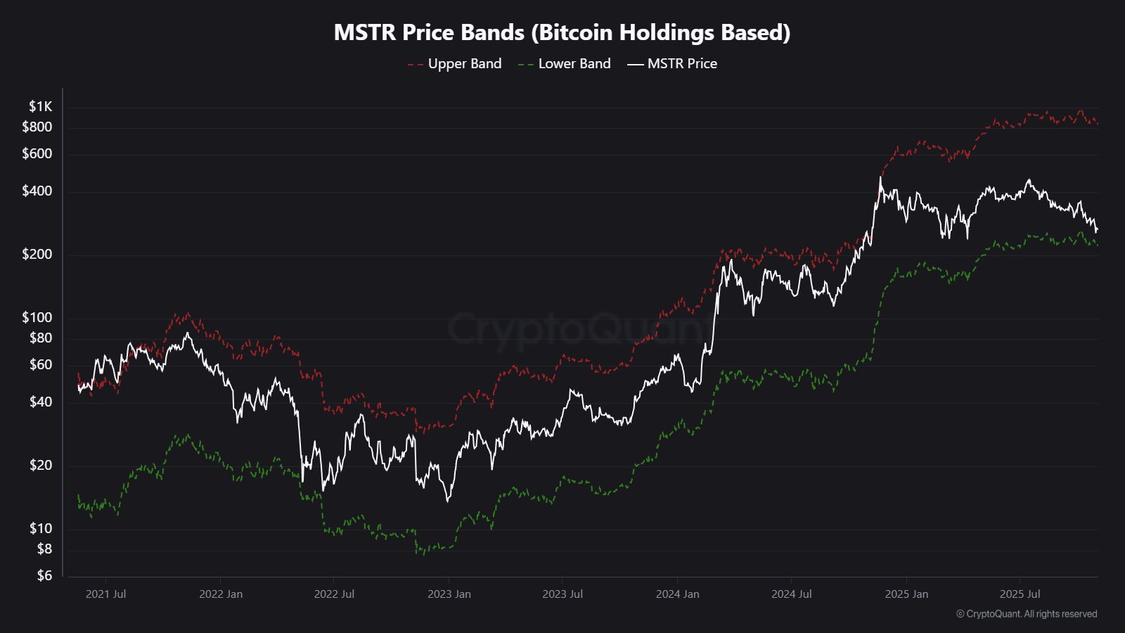 クリプトクオントのチャートによれば、MSTR株価は2024年から2025年初頭にかけて大幅に上昇し、一時は上限バンド付近まで達していたが、その後急落。史上最高値からのドローダウンも拡大している。