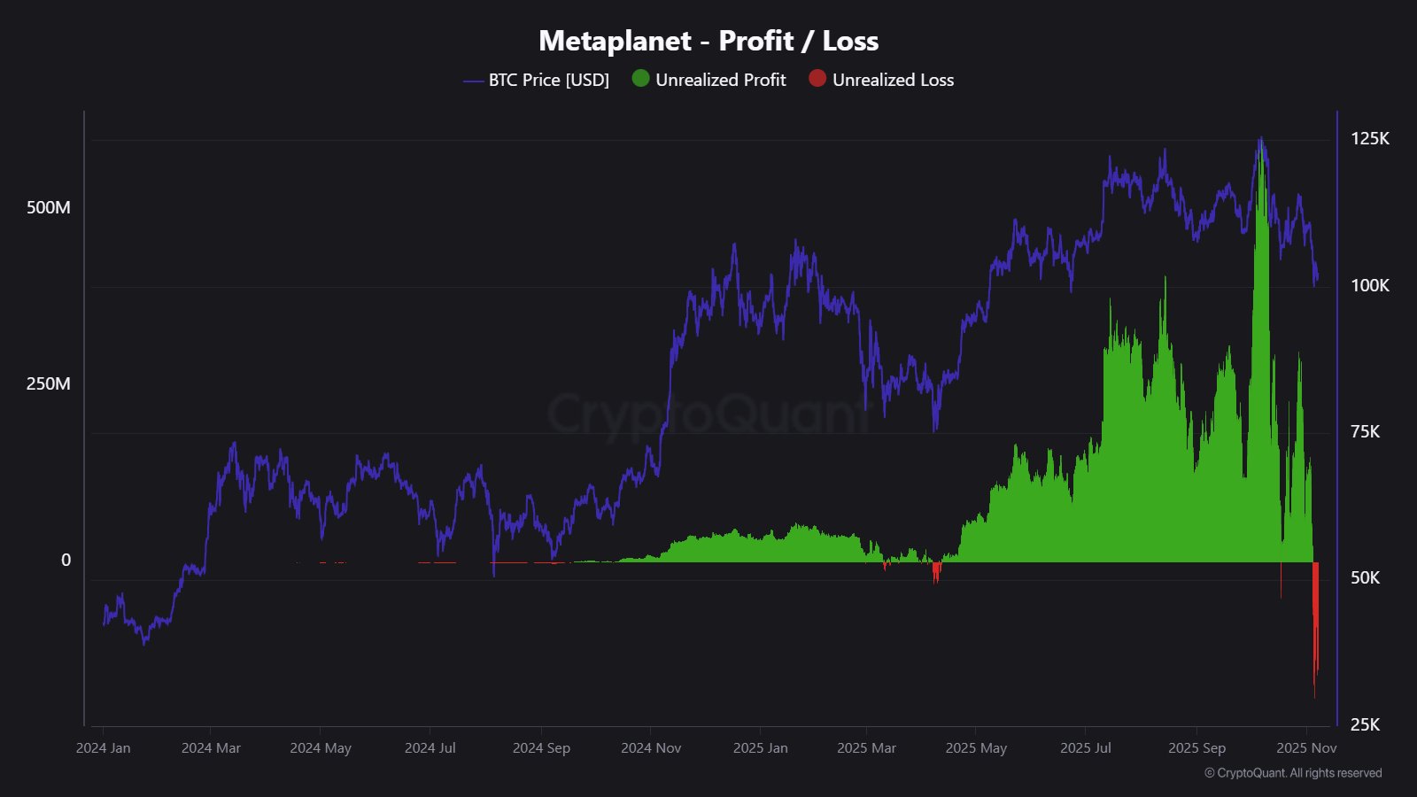 クリプトクオントは同社のチャートで、2024年初頭から継続的にBTCを蓄積してきた様子を示しており、ビットコイン価格の上昇期には大幅な含み益を記録していたことがうかがえる。