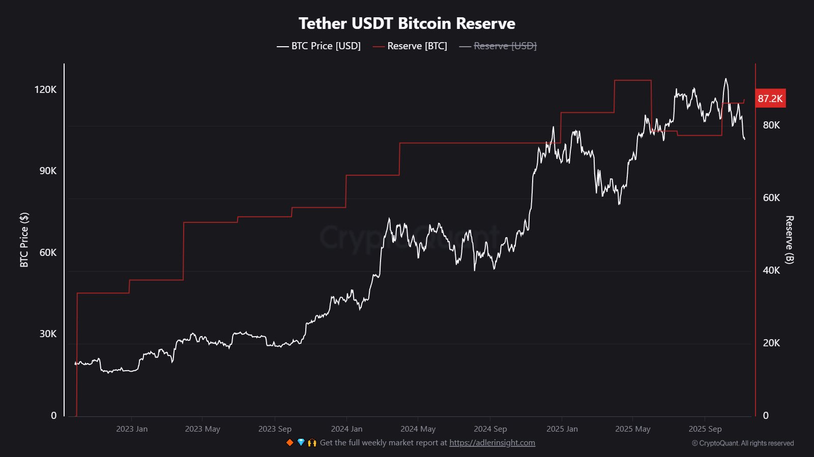 一方、ステーブルコイン発行企業テザーは8.72万BTCを準備金として保有しているが、同社のビットコイン保有戦略は安定的に推移している。