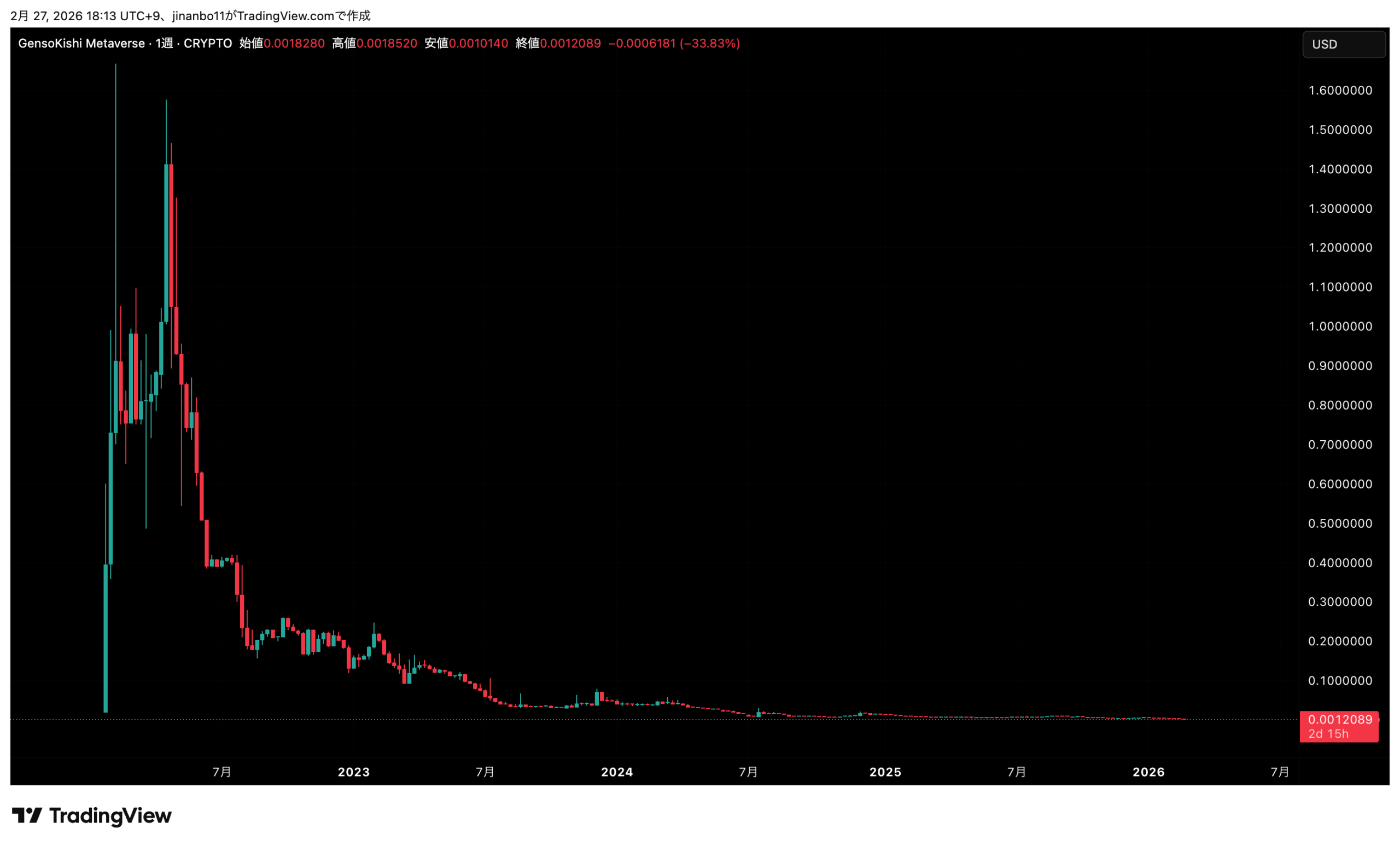 独自トークンMVはゲーム正式リリースに先立ち2021年12月に市場へ登場し、2022年1月27日のBybit上場から約10日後の2月8日に約1.67ドルの最高値を記録した。その後は長期的な下降をたどり続け、2026年2月27日時点では約0.0012ドルまで下落。最高値比の下落率は約99.9%に達する。トークン経済圏の縮小がゲーム存続を困難にした一因とも見られる。