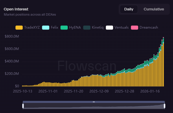 分析ツールであるFlowscan(フロースキャン)のデータによると、HIP-3市場全体の累積取引高は250.6億ドル(約3兆8,665億円)に達している。取引件数は2,600万件を超え、ユニークユーザー数は7.59万人に上る。