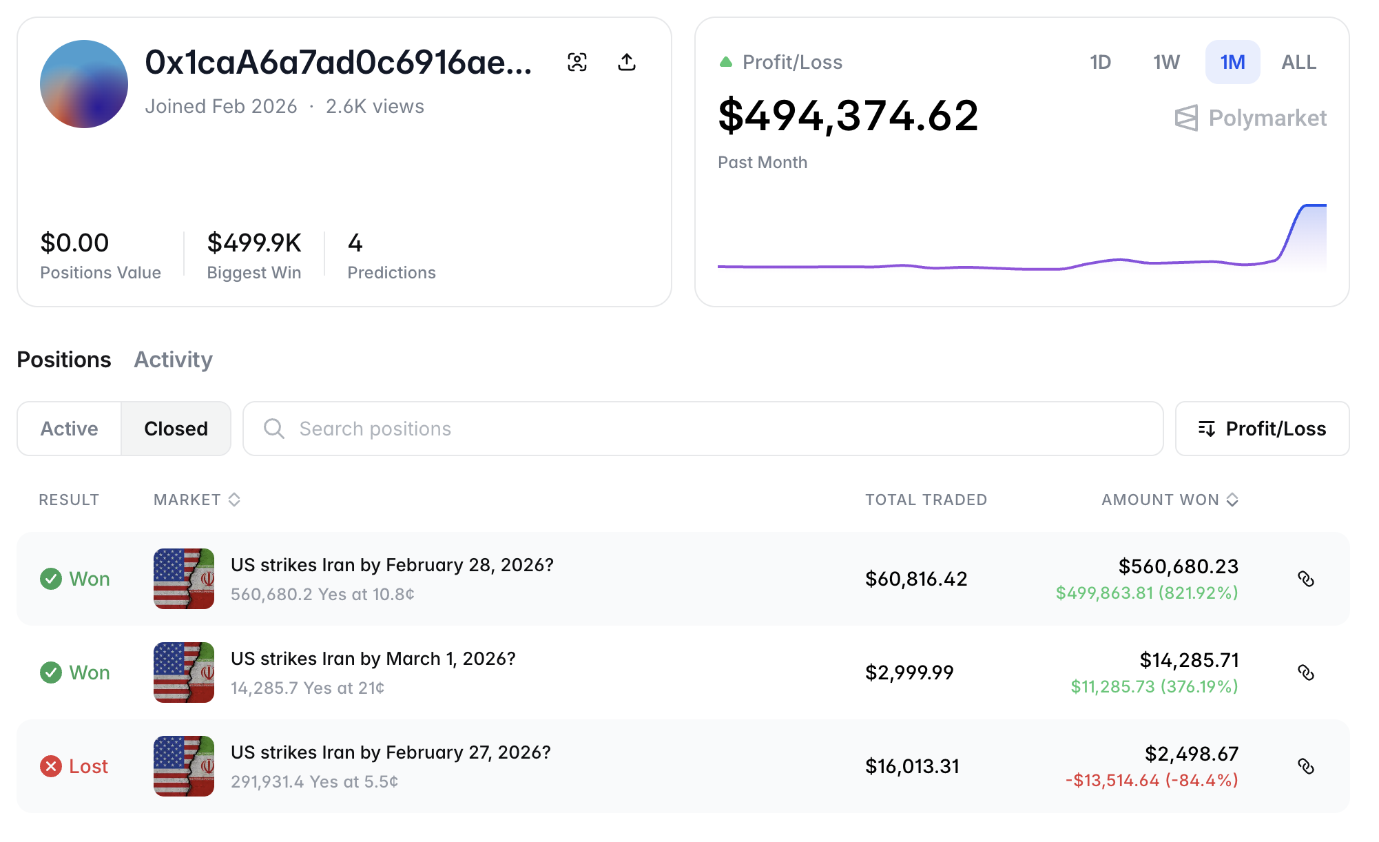 対象の予測市場は「米国は2026年2月28日までにイランを攻撃するか?」という設問で、複数のウォレットが攻撃の24時間以内に新規資金を入金した後、低確率(10〜20セント)の「Yes(はい)」ポジションを大量購入していた。