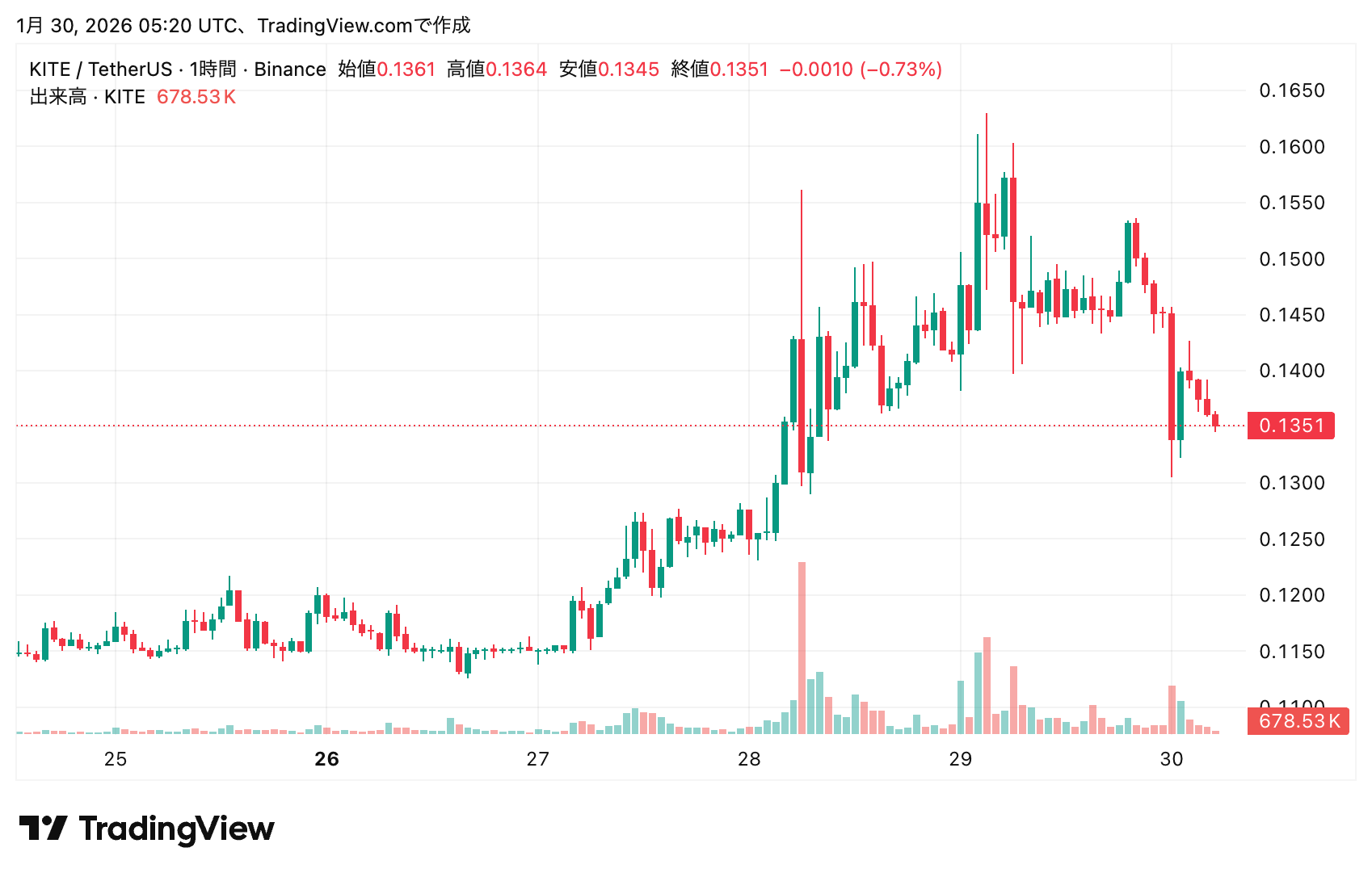 KITE価格は顕著な上昇を見せた。TradingViewのチャートによると、発表前の26日に0.115ドル前後で推移していたKITEは、27日の発表後から上昇トレンドに転じた。28日には0.155ドル台まで上昇し、29日には一時0.165ドル付近の高値を記録。発表前と比較して約43%の急伸となった。