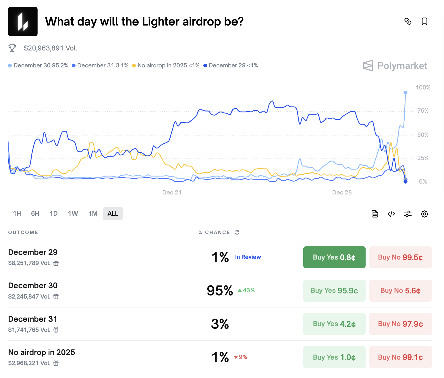 分散型予測市場ポリマーケットでは「ライターのエアドロップ実施日」を予測する市場が開設され、取引高は約2,096万ドル(約32.7億円)に達している。12月30日実施の確率は95%、12月31日が3%、2025年中のエアドロップなしが1%未満となっており、市場参加者の大半が年内のエアドロップ実施を予想している状況だ。
