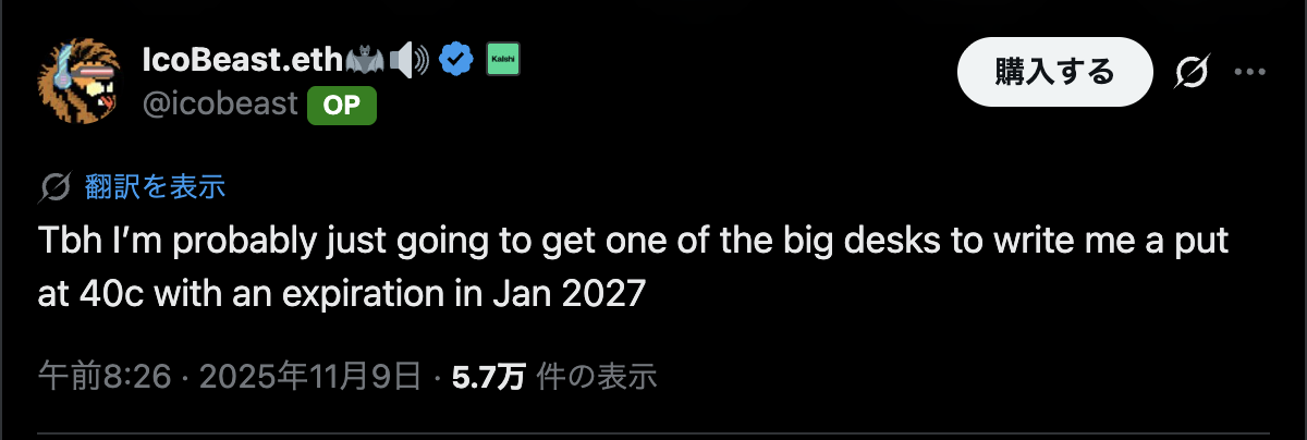 さらに同氏は「大手デスクから行使価格0.40ドルのプットオプションを購入し、2027年1月満期にする」と具体的なヘッジ戦略まで明かした。