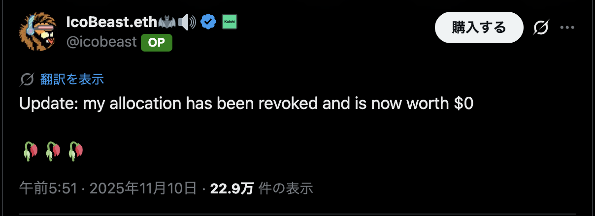 IcoBeast氏は11月10日、「アップデート:私の割当は取り消され、現在価値ゼロになった」と投稿し、事態を確認した。