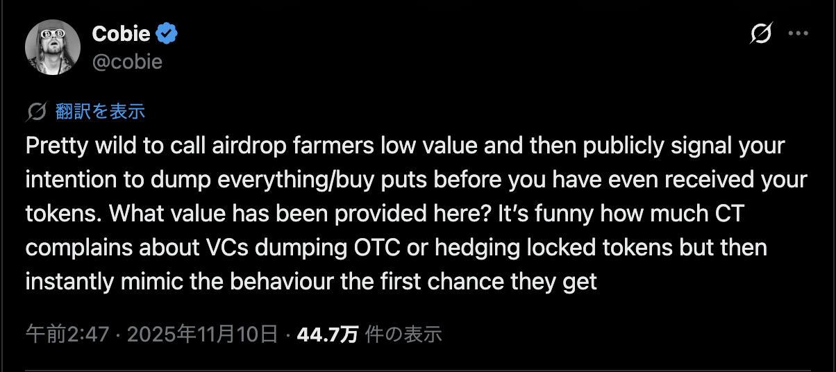 この発言に対し、ICOプラットフォーム「Sonar」運営者のCobie氏が「エアドロップ農家を低価値と呼びながら、自分はトークン受領前に売却やプット購入を公言するのは矛盾している」と批判。コミュニティ内で賛否が分かれる議論となった。