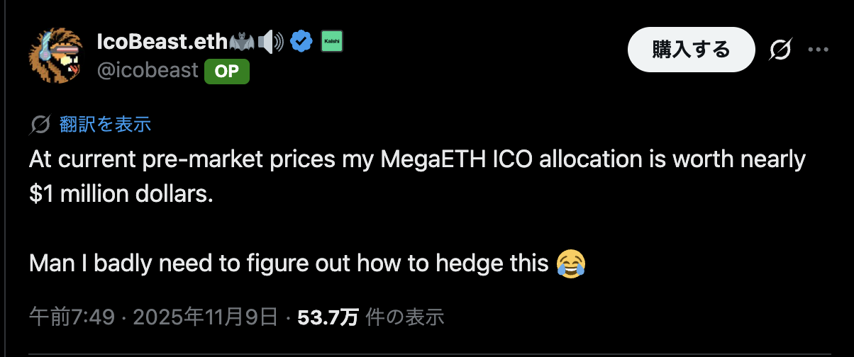 事の発端は11月9日、IcoBeast氏がX(旧Twitter)上で「MegaETHのICO割当が約100万ドルの価値になった。ヘッジ方法を考えないと」と投稿したことだった。
