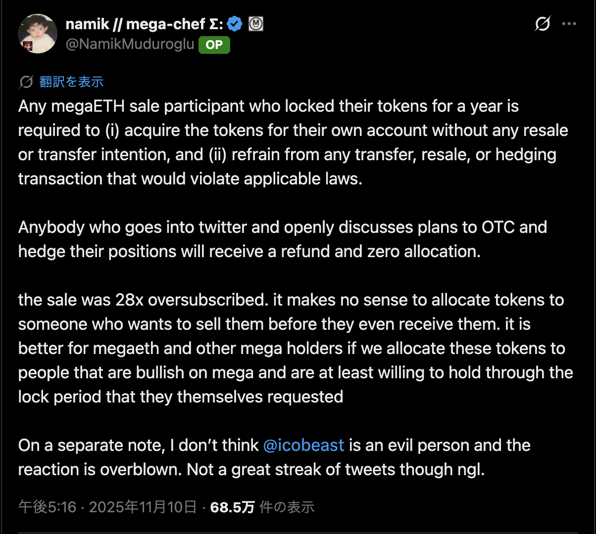 MegaETHの最高戦略責任者(CSO)Namik Muduroglu氏は11月10日、X上で経緯を説明。「1年間トークンをロックした参加者は、転売やヘッジを行わない条件に同意している。OTC取引やヘッジ計画を公然と議論する者には、返金と割当ゼロで対応する」と表明した。