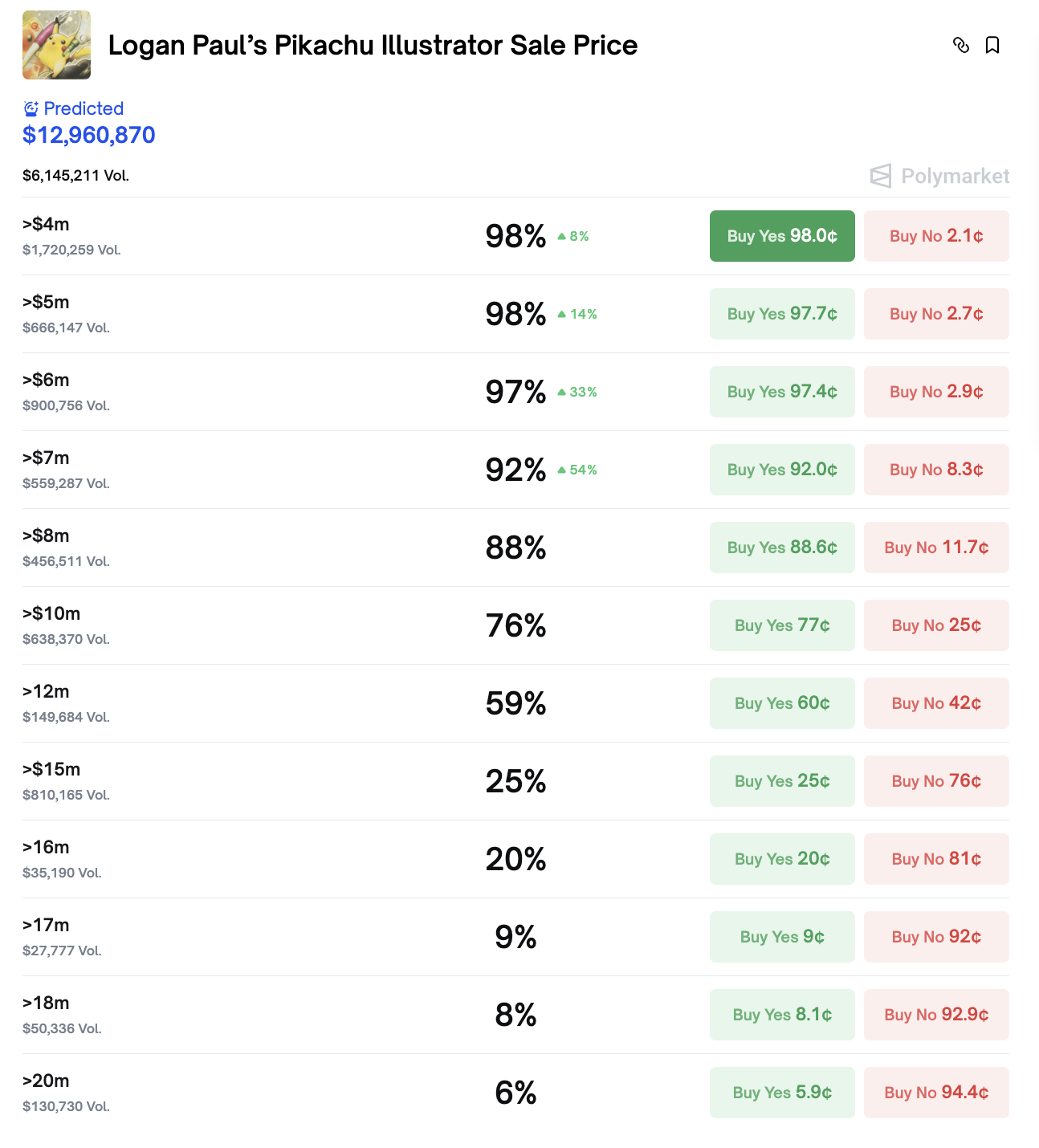 1月22日時点のデータによると、600万ドル超の確率は97%、1,000万ドル(約15億8,600万円)超の確率は76%と予測されており、市場参加者の大半が記録的な高値での落札を見込んでいる。1,500万ドル超の確率は25%、2,000万ドル超の確率は6%となっており、極端な高値予測も一定数存在する。取引量が最も多いのは400万ドル超の予測で約172万ドル、600万ドル超では約90万ドルの取引が成立している。