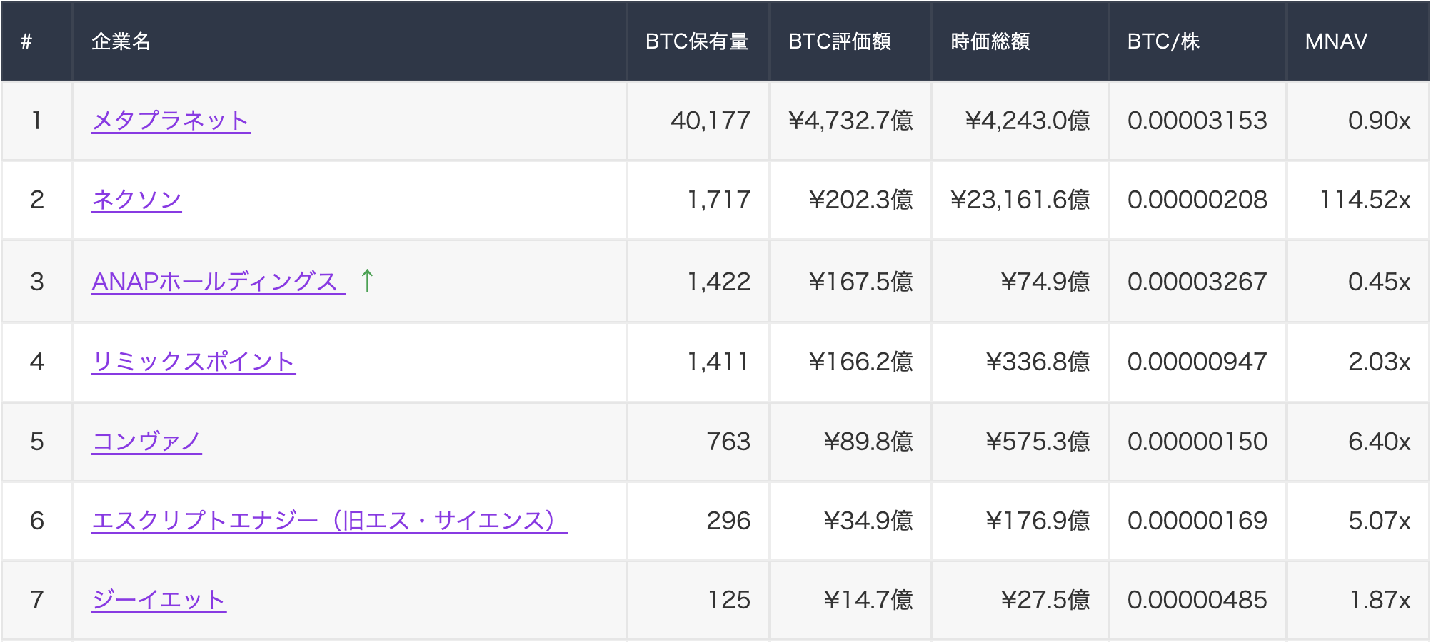 なお、国内上場企業全体のビットコイン総保有量は46,314.56 BTC(約5,455.7億円)で、全BTC供給量の0.2314%を占める。首位はメタプラネット(3350)で40,177 BTCを保有しており、エスクリプトエナジーはネクソン、ANAPホールディングス、リミックスポイント、コンヴァノに次ぐポジションだ。