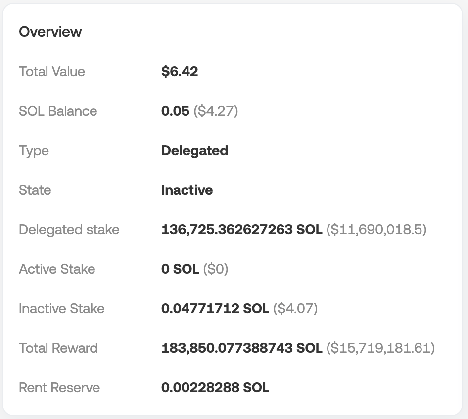 さらに推定関連アドレスでは約150万SOLがステーキングされており、これは約1億2,200万ドル(約186億円)に相当する規模となっている。