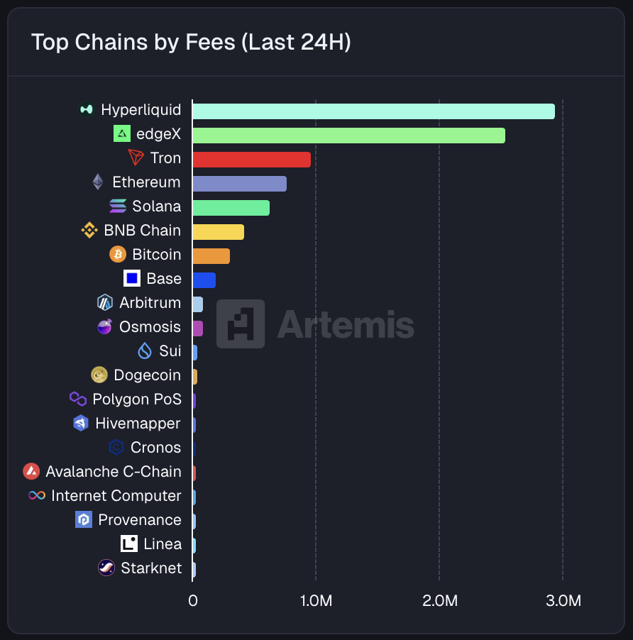暗号資産データ分析サイト「Artemis」のデータによると、直近24時間の手数料(Fees)ランキングにおいて、Perp DEXあるいはPerp DEXを主要アプリとするチェーンが上位を占めている。