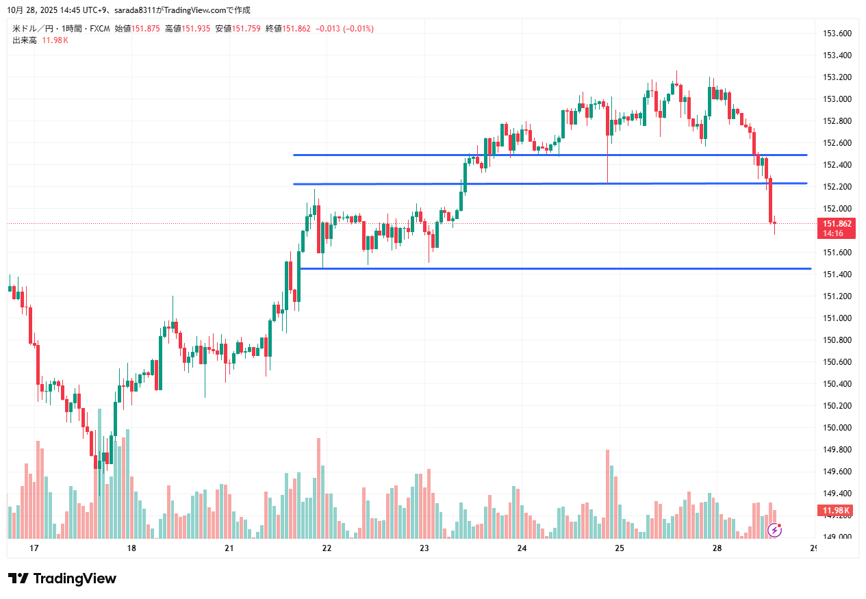 テクニカル面では、今月10日に付けた153.27円前後の高値を目前に伸び悩んだため、区切りと見た利益確定の売りが入り、明日・明後日のイベントに向けた調整が行われているように感じる。